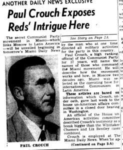 Paul Crouch was another former communist who tried to cash in on his time in the Party. As his biographer Gregory Taylor argues, Crouch had a “Manichean perspective” – he saw the world in black and white – communist or anticommunist. After he left the Party in 1942, he stayed quiet for awhile. Then when he lost his job and needed to find a source of income he turned to anticommunism.