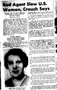 In 1949, Crouch did a series of articles for the Miami Daily News revealing scintillating details about the communist underground. In the May 10 edition Crouch accusing George Mink of killing Juliet Stuart Poyntz. Crouch said that Poynz was a close personal friend though he called her Julia and erroneously said she was from New England. The reaction to Crouch’s claims were explosive. The story was carried nationwide in several newspapers and caught the attention of local law enforcement and the FBI.