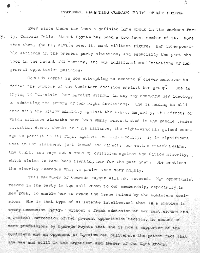 In 1924, Lenin died. Before his death internal leadership conflicts led to division with the Soviet Communist Party that reverberated to the WPA. Lore and Poyntz were in a left-wing faction which sent Moissaye Olgin to Moscow to seek guidance. Lore’s faction was condemned because it allegedly resembled Leon Trotsky’s; Lore was expelled from the Party in 1925. Because Poyntz would not condemn Lore, she came into conflict with the Party leadership.
