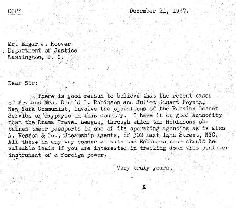 In the National Archives files there are two informant letters originally sent to J. Edgar Hoover about the Robinson-Rubens case and Poyntz. One of the letters was sent to Hoover on Christmas Eve 1937 claiming that Poyntz was kidnapped by the Soviet Secret Police. The other letter was from a gentleman who believed he had seen the Robinsons-Rubens in Spain. Hoover forwarded the letters to the Department of State washing himself of the cases.