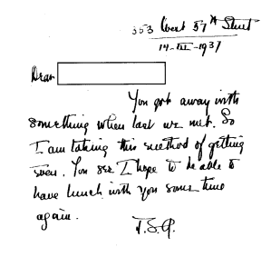 I also requested Poyntz’s FBI file; one would imagine that if an American citizen went missing and people close to her claimed she was a spy, the FBI would have been interested. Unfortunately, all that they released was a 13-page report on a handwriting analysis. The analysis was done at the request of New York State authorities in 1944 to see if Poyntz was still engaged in espionage – seven years after she disappeared.
