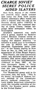 In the wake of Carlo Tresca’s murder, his friends had created a Memorial Committee to push the police to solve the murder. After Budenz’s book was published, the Committee under socialist Norman Thomas’s leadership, urged the New York Assistant District Attorney to put Budenz on the stand to find out if he knew more about Tresca and Poyntz. Unfortunately for the committee he did not provide any new information.