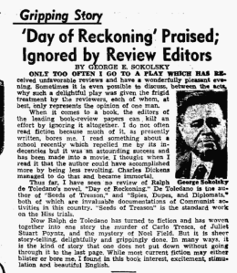 The book was not very popular and did not do very well commercially. De Toledano’s friend and fellow anticommunist journalist George Sokolsky took up the effort to defend the book. Sokolsky had a nationally syndicated column; he claimed that reviewers refused to review the book and that book stores purposefully hid it because it was anticommunist. Conspiracy theories aside, the book was reviewed, particularly in mainstream press outlets like the New York Times. Anticommunist Granville Hicks reviewed it for the Times and he called it “manufactured melodrama.” Sokolsky’s claim that bookstores were hiding it is hard to prove, but given the popularity of anticommunism, its hard to blame the book’s poor sales on that.